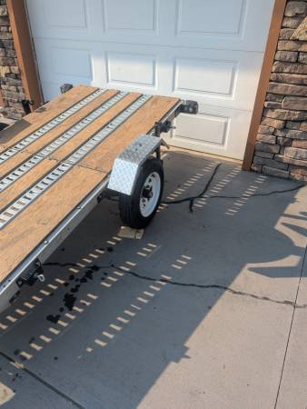 Marlon 4'x8' folding aluminum trailer. Deck is 5/8" plywood with three 8' lengths of e track to secure the load. This is a great light weight aluminum trailer that easily folds up for storage. To use as a motorcycle trailer, I have a optional motorcycle chock that attaches to the etrack that I will sell for $75.